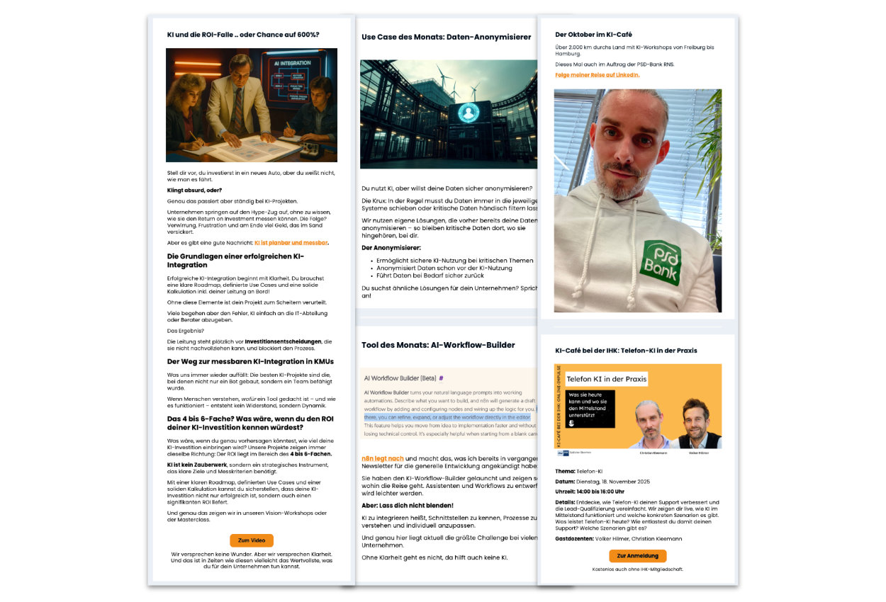 - Fokus auf KI-Integration, Use Case, Webinar und Tool des Monats